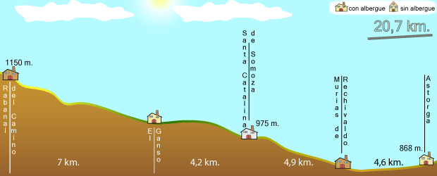 Heute hatten wir die 1. Bergetappe seit langem. Da es nur 20 KM waren haben wir bis um 6Uhr 15 ausgeschlafen und sind um 7 Uhr gestartet. Nachdem wir Astorga verlassen haben kamen wir schon sehr schnell zum naechsten Dorf Santa Catalina und von da zum Dorf el Canzo. Der Weg stieg stetig an aber er war nicht sehr schlimm. Da gleichzeitig der schoene Sonnenaufgang war bemerkten wir gar nicht wie es langsam nach oben ging.